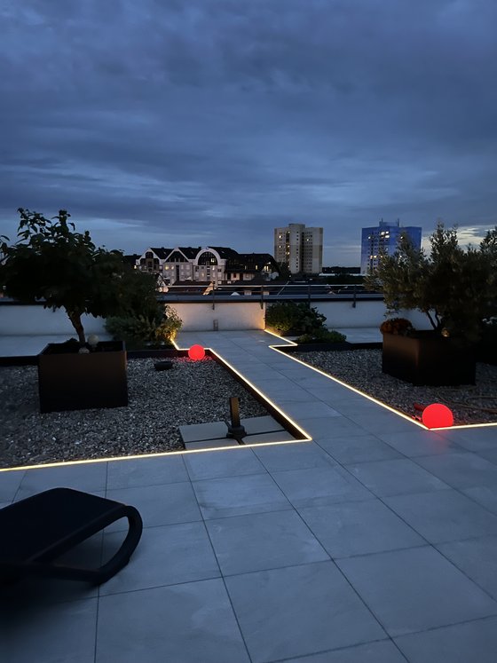 Bringen Sie Ihre Terrasse mit dem stilvollen LED-Lichtsystem von Gutjahr zum Leuchten. Das elegante Design sorgt für stimmungsvolles Licht in warmweiß oder mit farbigem Wechselspiel – ganz nach Ihrem Geschmack.