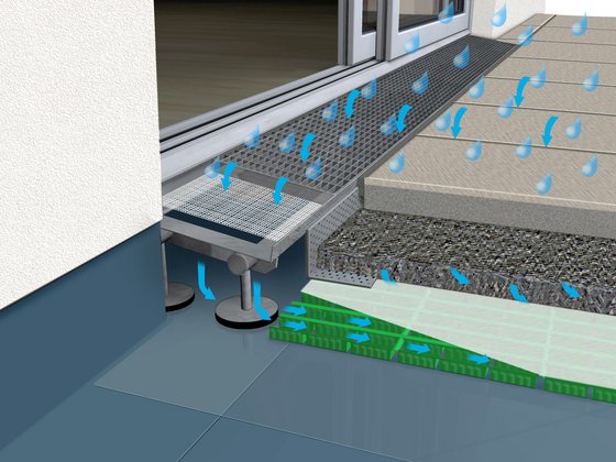 Drainroste werden vor schwellenlosen Terrassen- oder Balkontüren angebracht und verhindern Stau- und Druckwasser. Der Drainrost, oft als Rampe eingebaut, leitet Wasser über ein angeschlossenes Drainagesystem sicher ab, sodass kein Wasser in den Innenraum gelangt.