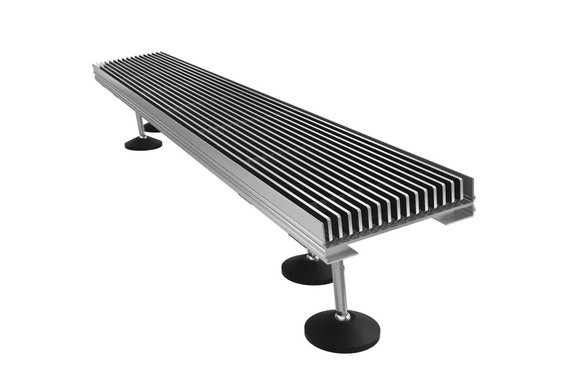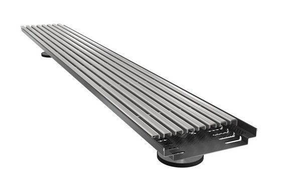 Nach unten offene Roste für rückstaufreie Entwässerung, höhenverstellbar, teilweise ablängbar, mit Schmutzgitter gegen Versottung.